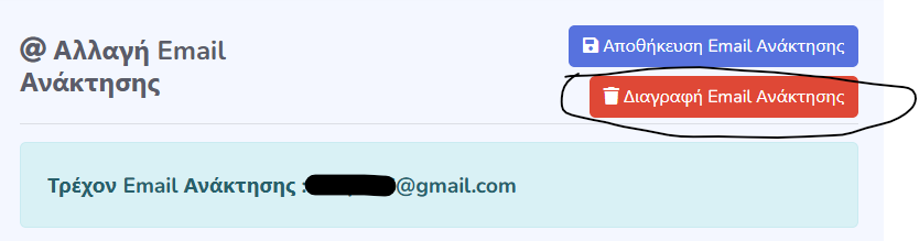 Σημείωση: Υπάρχει δυνατότητα διαγραφής του υπάρχοντος Email Ανάκτησης (χωρίς καταχώρησης νέου), απλά επιλέγοντας το κουμπί “Διαγραφή Email Ανάκτησης” πάνω δεξιά.