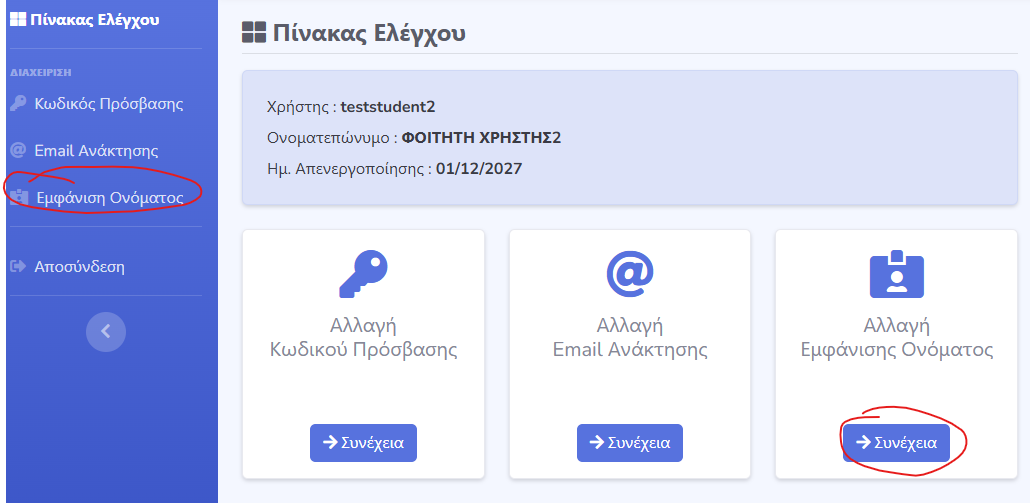 3. Να μεταβεί στην καρτέλα “Εμφάνισης Ονόματος”, είτε επιλέγοντας το “Εμφάνισης Ονόματος” στο αριστερό μενού της εφαρμογής, είτε πατώντας το κουμπί “Συνέχεια” κάτω από την επιλογή “Αλλαγή Εμφάνισης Ονόματος”.