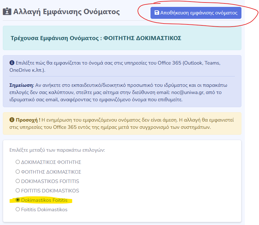 4. Να επιλέξει μία απο τις διαθέσιμες επιλογές και να πατήσει το κουμπί “Αποθήκευση εμφάνισης ονόματος” πάνω δεξιά.