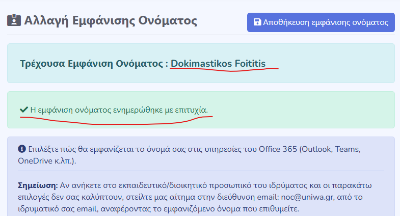 - να αλλάξουν το εμφανιζόμενο όνομα του ιδρυματικού λογαριασμού τους στις υπηρεσίες του Office 365 (Outlook, Teams, OneDrive, κτλ).