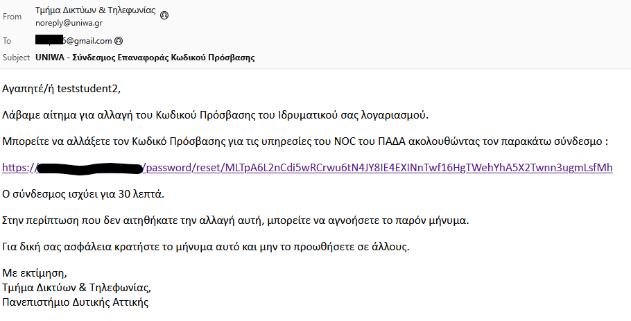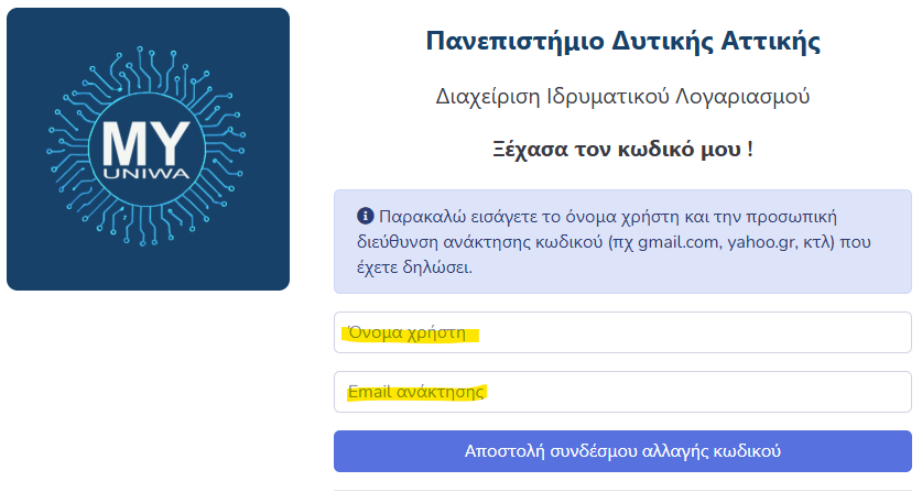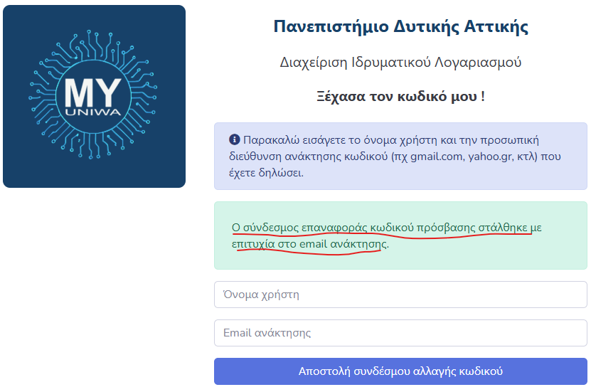 - να εκδώσουν νέο κωδικό (reset password) για τον ιδρυματικό λογαριασμό τους χρησιμοποιώντας το email ανάκτησης που υπάρχει ήδη κατοχυρωμένο στον λογαριασμό τους.