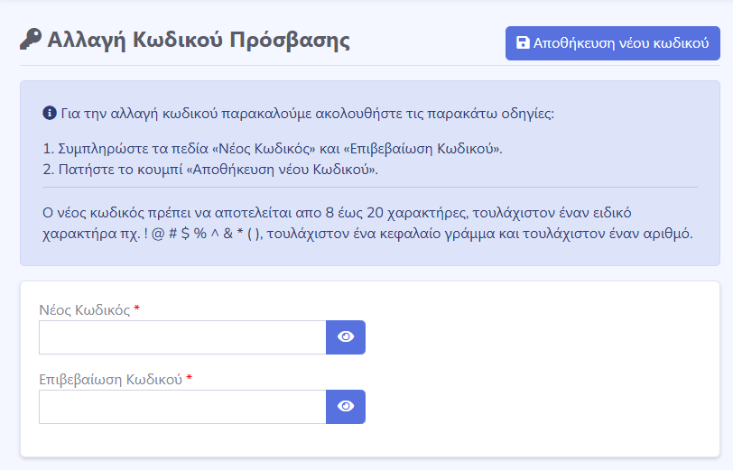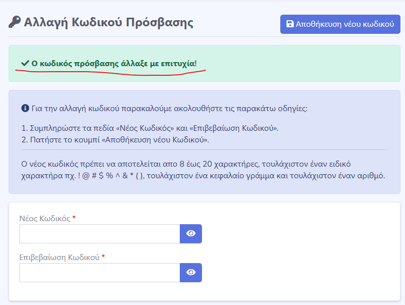 4. Εφόσον επιθυμεί να αλλάξει το τρέχοντα κωδικό του λογαριασμού του, θα πρέπει στην καρτέλα “Αλλαγή Κωδικού Πρόσβασης” να εισάγει τον νέο κωδικό που επιθυμεί και να πατήσει το κουμπί “Αποθήκευση νέου κωδικού”. Εφόσον ο νέος κωδικός είναι σύμφωνος με τους περιορισμούς που περιγράφονται, θα εμφανιστεί στο πάνω μερός της εφαρμογής το μήνυμα “Ο κωδικός πρόσβασης άλλαξε με επιτυχία!”.