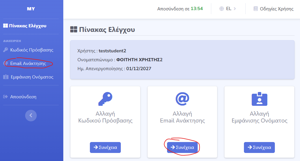 - να προσθέσουν νέο ή να τροποποιήσουν το email ανάκτησης του ιδρυματικού λογαριασμού τους.