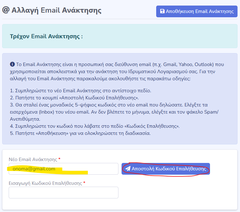 4. Να καταχωρήσει ένα νέο προσωπικό email ανάκτησης (πχ onoma@gmail.com) και να πατήσει το “Αποστολή Κωδικού Επαλήθευσης”.