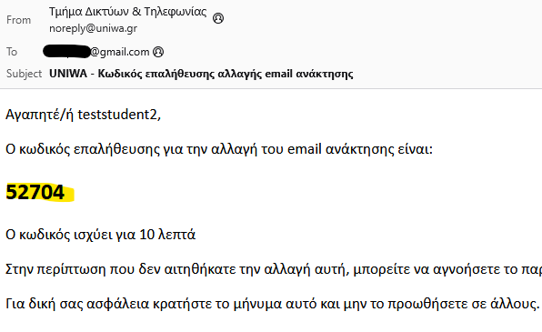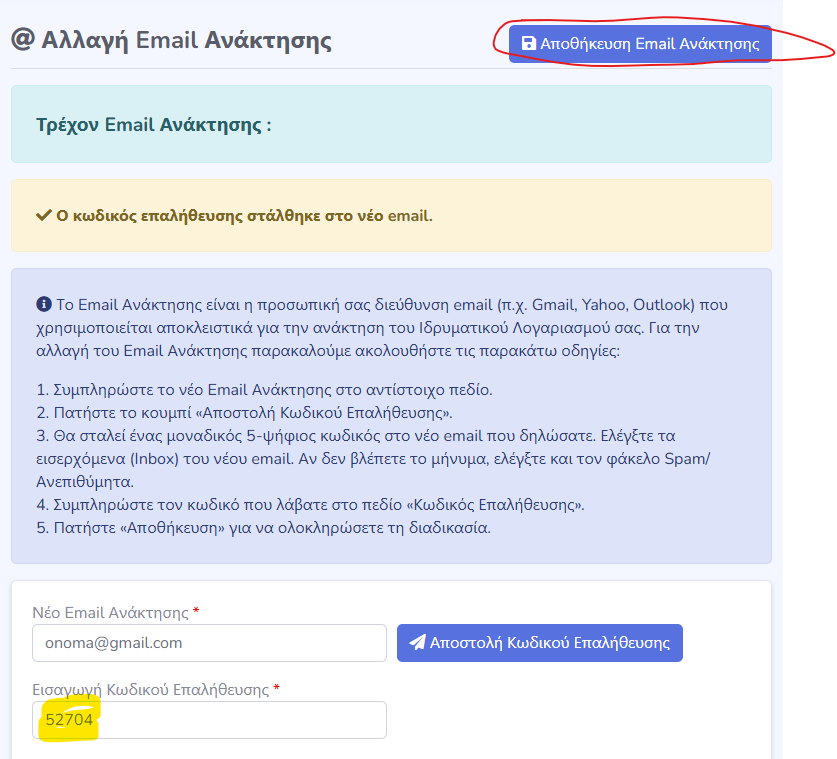 6. Στο email αυτό υπάρχει ένας πενταψήφιος αριθμός, το οποιο θα πρέπει να καταχωρήσει στο πεδίο “Εισαγωγή Κωδικού Επαλήθευσης”. Στην σύνεχεια θα πρέπει να πατήσει το κουμπί “Αποθήκευση Email Ανάκτησης” πάνω δεξιά.
