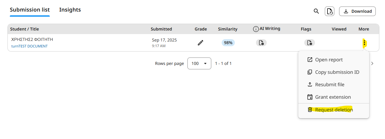 Η διαδικασία για την μόνιμη διαγραφή ένος Paper από την βάση του Turnitin έχει ως εξής: