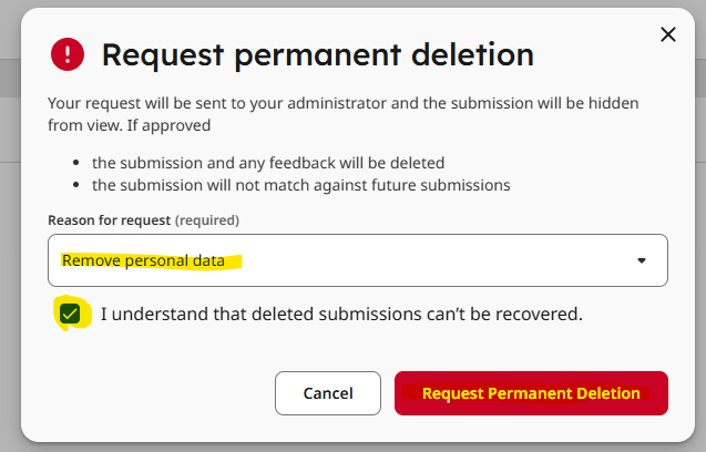 - στο παράθυρο που θα εμφανιστεί θα πρέπει α) να επιλέξει μια αιτιολογία για την διαγραφή, β) να αποδεχθεί το “I understand that deleted submissions can't be recovered” και να τέλος να επιλέξει το “Request Permanent Deletion”