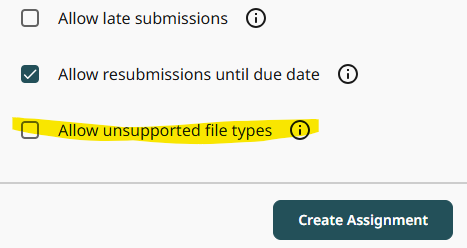 Εάν θέλετε να ανεβάσετε ένα αρχείο διαφορετικό από τους παραπάνω τύπους αρχείων, μπορείτε κατά την δημιουργία της εργασίας να επιλέξετε “Allow unsupported file types”. Σε αυτή την περίπτωση υπάρχει η πιθανότητα το Τurnitin να μην μπορέσει να δημιουργήσει Originality Report για τον τύπο αρχείου που χρησιμοποιήσατε.
