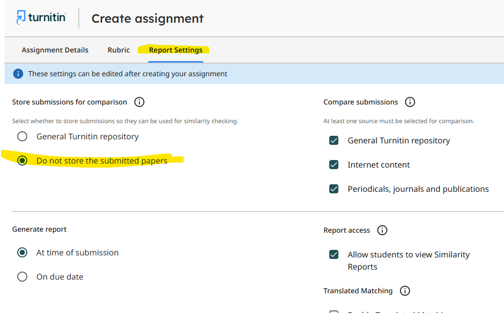 Αν θέλετε απλώς να ελέγξετε το ποσοστό ομοιότητας μίας εργασίας ώστε να τη βελτιώσετε χωρίς αυτή να αποθηκευτεί μόνιμα στην βάση του Turnitin θα πρέπει να πάτε στα Reports Settings στην επιλογή “Store Submissions for comparison” και να επιλέξετε το “Do not store the submitted papers”.