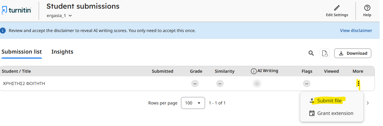 Α) Στην περίπτωση που η υποβολή έχει γίνει μέσω του web portal του Turnitin, τότε