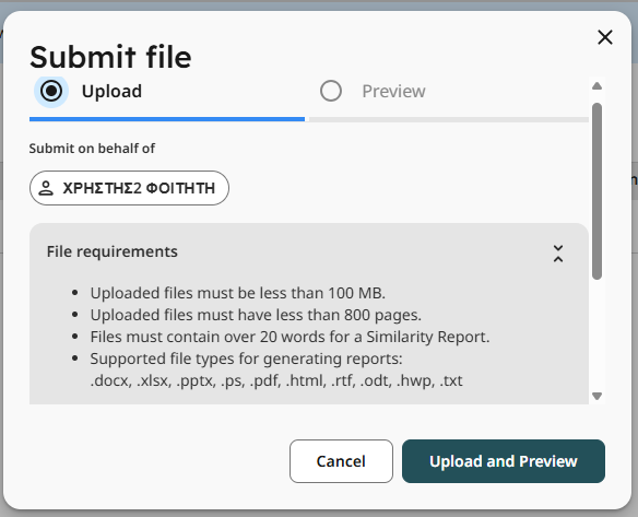 Το αρχείο δεν πρέπει να ξεπερνάει τα 100MB. Επίσης, αρχεία που είναι κλειδωμένα με password ή κρυπτογραφημένα δεν μπορούν να υποβληθούν στο Turnitin.