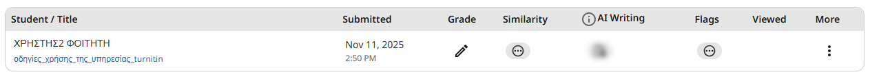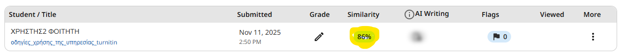 Για να δείτε το Originality Report κάνετε κλικ στο εικονίδιο που υπάρχει κάτω από την επιλογή similarity. (Αν το εικονίδιο είναι γκρι σημαίνει ότι το report δεν έχει ακόμα δημιουργηθεί, σε αυτήν περίπτωση δοκιμάστε ένα refresh της σελίδας).