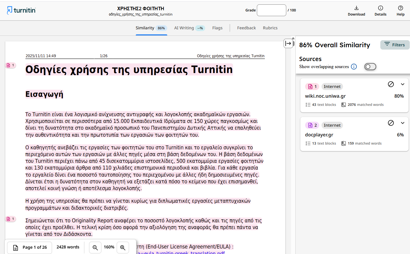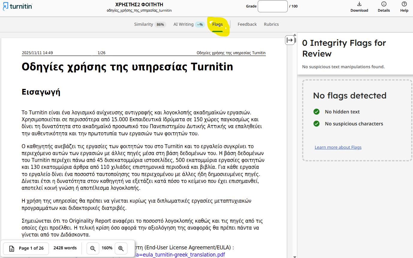 Πληροφορίες για τον μηχανισμό αυτό θα βρείτε στην διεύθυνση: https://guides.turnitin.com/hc/en-us/articles/23351259442829-Flags-in-the-Similarity-Report