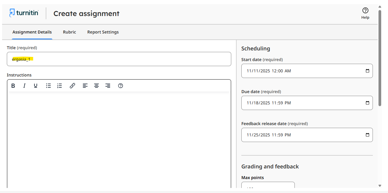 Εισάγετε ένα τίτλο “Title” και επιλέγετε ένα start και ένα due date. Οι ημερομηνίες start και due date ορίζουν το χρονικό διάστημα κατά το οποίο μπορούν να υποβάλλονται εργασίες.